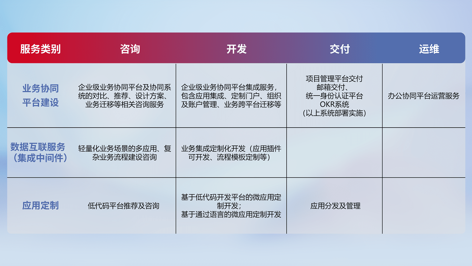 针对钉钉、、、企微、、IDaas等平台级产品提供产品的规划、、方案、、、、交付、、、定制化开发等服务,,,实现如统一协同办公、、、智能客户服务、、混合会议管理、、智能数据查询、、、、等业务场景,,,实现数字化转型。。。。